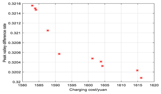 In order to determine final charging strategy, we must make a selection based on the optimal solution set generated in Table 2. The selection can be based on the importance of comparing the two optimization objectives. As the premise for users to obtain better economic efficiency is that the PG can operate safely and reliably, the optimal solution should be prioritized. Considering the minimum PVLD of the PG load, the scheme with a PVLD rate of 32.01% and a CC of CNY 1616.057 is chosen as the charging strategy scheme.