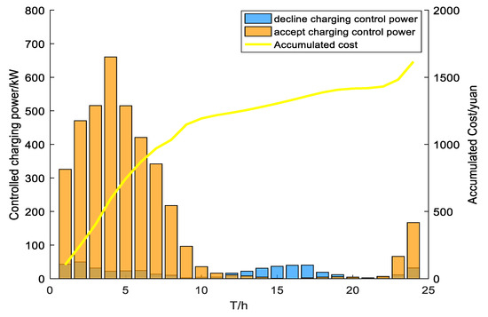 Figure 4 shows the decline and accept charging control power, reflecting the proportion and charging time of users who comply with the grid arrangement for charging and those who do not. The number of users who comply with the grid arrangement for charging in the figure is 878, and the number of users who do not comply with the grid arrangement for charging is 122. Users who do not comply with the grid arrangement for charging will start charging as soon as they arrive at the station. From the figure, it can be clearly seen that the decline charging control power is higher from 13 o’clock to 18 o’clock and from 24 o’clock to 6 o’clock. Most of these periods are during periods of low electricity prices, and the cost of starting charging is relatively low. Compared to simply following the grid arrangement, it can better compensate for the interests of users.