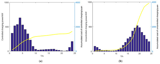 Under this charging strategy, the controlled and uncontrolled charging power and CC are shown in Figure 5a,b: