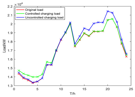 where Pcharge is all EVs’ total CL; N is EVs’ number in the PG; and Pz,j is the charging power of the z-th EV during time period j. Dividing a day into 24 time periods by the hour, denoted as j = 1, 2, 3 … 24, and adding the CL of EVs to the original base load, the following can be obtained [26]: