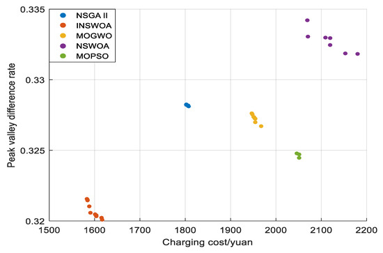 In order to fairly compare the optimization capabilities of the INSWOA used in this paper with other algorithms, a maximum iteration count of 100 and a population size of 50 were unanimously selected. The NSGA-II algorithm, multi-objective particle swarm optimization (MOPSO), multi-objective gray wolf optimizer (MOGWO), NSWOA, and INSWOA used in this paper were chosen to verify the performance and Pareto of the INSWOA [35,36,37]. The solution set is as follows: