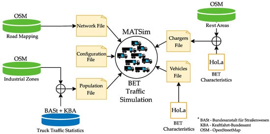 We employ MATSim, an activity-based multi-agent transport simulation, where each vehicle is represented by one agent executing predefined plans with specific origins and destinations []. By leveraging the detail level, the utilization of charging infrastructure can be analyzed regarding potential bottlenecks. Our simulation model is an improvement of [] and takes input data from Open Street Map for road mapping, rest areas and industrial zones as well as official German truck traffic statistics as shown in Figure 1. The model has undergone statistical validation based on extensive traffic counts. A detailed description of the model and the pre-processing of input data can be found in [].