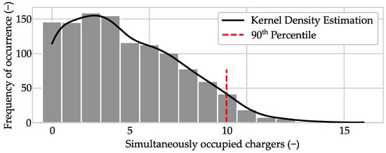 In a demand-based distribution of charging stations, it is crucial to evaluate how the number of charging points correlates with potential queues and associated waiting times for effective allocation of charging infrastructure. This assessment utilizes variable percentiles for different scenarios, where a “percentile” in statistics refers to a value below which a certain percentage of values (in this case, the number of charging processes) in a distribution falls. The 100th percentile means all BETs can charge when they arrive at a charging location. However, this results in an inefficient charging infrastructural design. Figure 2 shows the application of the 90th percentile. Meaning, for this specific charging location the number of chargers is reduced to nine chargers, enabling 90% of all charging processes while 10% needs to wait.