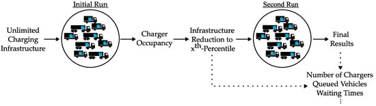 Our approach to data processing for every electrification scenario with MATSim is divided into two stages (see Figure 3). In the initial MATSim run, we send the BETs with their predefined plans and provide enough available chargers per location. This scenario yields the maximum number of simultaneously occupied charging stations, which can then be reduced to a desired percentile. To further analyze the resulting waiting times and the proportion of waiting BETs, we conduct a second simulation using the same scenario but with a demand-oriented distribution, based on the percentiles.