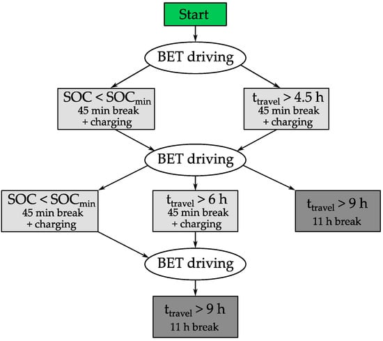 Some of our assumptions may be regarded as too conservative. It is conceivable that the number of charging-required breaks could be reduced in the future. First, future larger batteries will emerge, improving the range of BETs if the volumetric and gravimetric density of battery cells is increased. Second, possibly lower energy reserves (SoCmin) could be safely utilized as logistics companies gain experience and the charging network becomes denser. It is essential to note that traffic-related exceptions, including traffic jams and the resulting congestion in parking areas, have not been considered here.