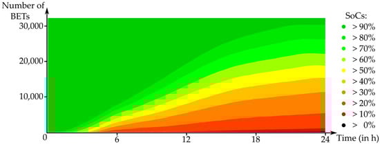 In previous simulations, it was assumed that a fleet could replenish its battery capacity before starting the trip either at a depot or using public charging infrastructure. In this paper, however, we also want to analyze what additional charging requirements arise if the fleet operations rely completely on MCS, as a “worst-case scenario”. Therefore, we need depot SoC data for a truck fleet reliant solely on MCS-charging during 45-min breaks. Lacking access to such data, we adopt an approach to generate a synthetic SoC distribution for a truck fleet. Specifically, we simulate a scenario for a Monday, limited by computational capacities, involving a 20% BET fleet starting with 100% SoC and heading to predefined destinations. The charging points are determined by previously mentioned locations, with each site having an unlimited number of charging points. At the end of the simulated day, the vehicles arrive at their destinations with their remaining capacities, which, due to the absence of depot charging infrastructure, can also be used as the fleet’s initial SoC distribution for the next day. This statistical distribution is then applied to the different shares of BET fleets we analyze in this paper. The distribution of the fleet SoC over a day is shown in Figure 6.