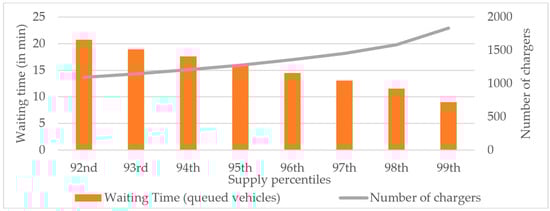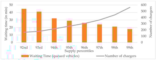 For this scenario, the required number of chargers ranges from 160 to 450. Regarding waiting time, it is demonstrated that the queue waiting time for vehicles can be progressively reduced from approximately 45 min to about 18 min. Furthermore, the proportion of vehicles waiting decreases from 35% to 5% as shown in Figure 7.