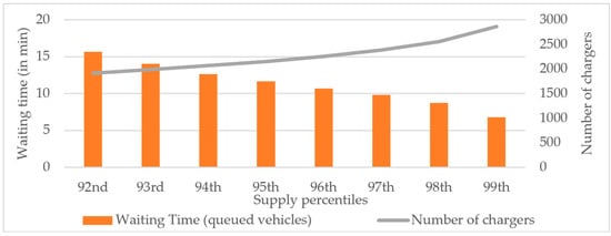In the second scenario, it is demonstrated that for lower supply reliabilities, waiting times of less than half an hour are observed. This duration can be reduced to under 10 min by expanding the number of chargers from 1092 to 1835 at the 99th percentile. Similarly, the proportion of vehicles waiting decreases from 25% to 3% (see Table 4 and Figure 8).