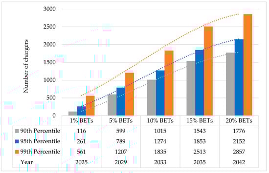 Incorporating insights from Shoman et al. [], our research indicates that Germany would require approximately 8124 to 10,155 depot chargers by 2029 to meet the demands of the 95th supply percentile for a 10% BET fleet, correlating to the given 4–5 depot chargers per MCS charger.