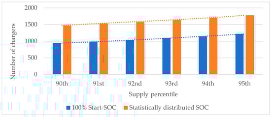 Referring to Speth et al. (2022) [], for an electrification level of 15%, the required number of chargers ranges between 765 and 950, assuming 50% of BETs engage in public charging. When scaled up to our scenario, this translates to an estimated need for 1530 to 1900 chargers, conservatively estimated, since effectively fewer chargers would be needed due to previously described effects. Nonetheless, our results are comparable, as they fall within the 90th to 99th percentile range considered.
