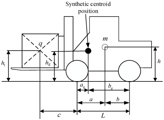 Where a, b is the horizontal distance between the center of mass and the front and rear axles at no load; c is the horizontal distance from the center of cargo to the front wheel grounding point; is the height of the core of the cargo; is the height of the center of mass of the forklift when unloaded; , is the horizontal distance between the synthetic centroid and the front and rear axles; is height of the synthetic centroid; is the quality of the goods to be handled; is the quality of the whole vehicle of the forklift; L is forklift wheelbase.