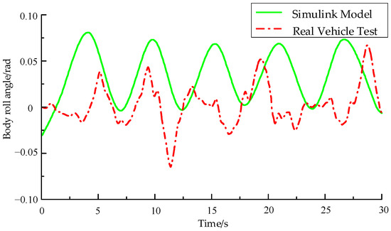 In order to verify the accuracy of the forklift mathematical model, this paper uses a serpentine working condition test to observe the changes in the forklift’s roll angle (Figure 4) and yaw angular velocity (Figure 5), and compares them with the roll angle and yaw angular velocity of the forklift collected in the actual vehicle test under the same working conditions. The simulation vehicle speed is set to 10 km/h.
