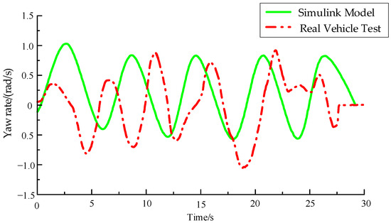 As shown in Figure 4 and Figure 5, under the 10 km/h serpentine condition, the change trend of the body roll angle and yaw rate reflected by the forklift mathematical model can be consistent with the data of the actual vehicle test, and the change range is also consistent. This verifies the accuracy of the model and provides a control basis for subsequent research [24].