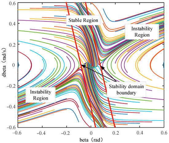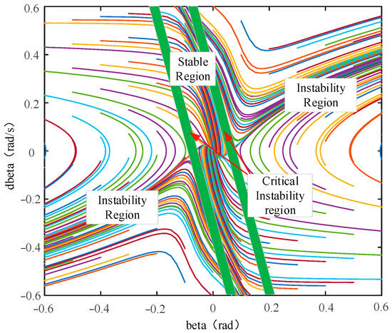 The center of mass sideslip angle–center of mass sideslip angle velocity phase plane is usually used to analyze and judge vehicle stability and has a high judgment accuracy in the case of vehicle instability [26]. Therefore, the center of mass sideslip angle–center of mass sideslip angle velocity phase plane is used to analyze the stability of the forklift. The stability of the forklift can be judged by observing the motion phase trajectory. The motion phase trajectory area that passes through the intermediate stable point is the stable area, and the area that does not pass through is the unstable area.