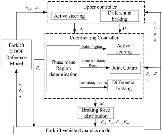 Among the existing rollover prevention control strategies, the lateral load transfer rate is a commonly used indicator for judging vehicle stability. It has the characteristics of high real-time performance and strong universality, but its value is affected by the accuracy of sensor measurement and there is no clear standard for determining the threshold [17,18,19]. The phase plane method is less affected by the accuracy of sensor measurement and does not need to consider the threshold value. It can judge the stability of the forklift more accurately [20]. In order to further improve the stability of electric forklifts, in addition to relying on accurate judgment of forklift stability, anti-rollover control methods must be adopted, such as anti-rollover cylinders, active steering and differential braking. Anti-rollover cylinders have good control effects, but the forklift structure is complex and difficult to control [21]. Active steering improves vehicle stability by applying additional steering angles to the steering wheels, but the control function will fail when the tire lateral force is saturated. Differential braking uses the tire longitudinal force to generate additional yaw torque to improve vehicle stability under extreme conditions, but it will affect the driving speed [22]. Active steering and differential braking coordinated control can reasonably and fully utilize tire lateral force and longitudinal force, combining the advantages of both to achieve vehicle stability control. In the anti-rollover coordinated control strategy of electric forklifts, the phase plane area division method is adopted to solve the problem of forklift stability judgment; considering the problem that active steering and differential braking are insufficient to control separately, an active steering and differential braking coordinated control strategy is designed. Finally, the effectiveness of this control strategy is verified by simulation.