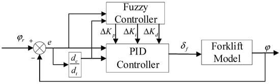 The fuzzy PID algorithm has good robustness and does not rely on mathematical models. Fuzzy rules designed based on expert experience can achieve good control effects. The difference e in the expected value of the body roll angle and the difference change rate ec are used as the input of the fuzzy PID controller, and the active steering rear wheel angle is used as the output. The control structure of the fuzzy PID is shown in Figure 9. The PID controller parameters are adjusted according to the results of fuzzy reasoning. The parameter values of the PID controller are determined as 300, 14, and 10, through simulation experiments.