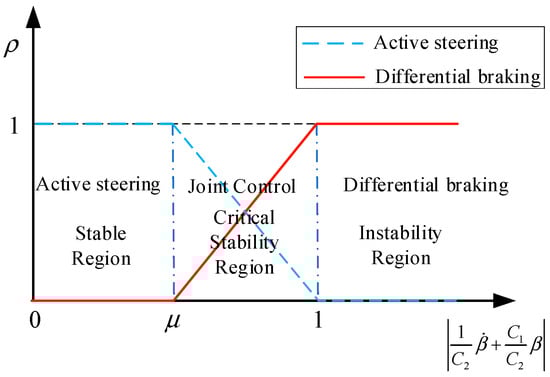 In order to achieve a good control effect and ensure the coordinated operation of the two controllers, the weight coefficient is introduced to control the two controllers. In the stable domain, due to the small yaw moment required, active steering control is adopted to ensure the driving speed of the forklift. In the critical stable domain, active steering and differential braking are used for joint control. As the instability of the forklift increases, the weight coefficient of differential braking control gradually increases. At this time, in the unstable domain, a large yaw moment is required to ensure the safe driving of the vehicle. Only differential braking control is used. At this time, the relationship between the differential braking weight coefficient and the control area is shown in Figure 10.