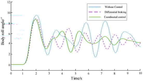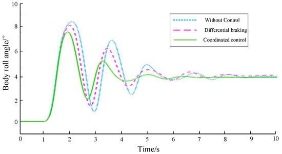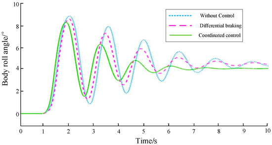 In order to verify the effectiveness of this control strategy for forklift anti-rollover control, a Matlab/Simulink simulation model was built with a 3T electric forklift as a reference. The main parameters of electric forklifts are shown in Table 4. Using the typical working condition of angular step steering, the steering wheel was turned from the initial state of 0° to 250° at a constant speed within 1 s. The forklift speed was 15 km/h. The three states of the forklift, namely, empty, half-loaded, and fully loaded, were analyzed, and the roll angle and yaw angular velocity of the forklift body were compared under no control, differential braking control, and coordinated control. The simulation results are shown in Figure 11, Figure 12, Figure 13, Figure 14, Figure 15 and Figure 16. At the same time, the peak value and stable time are compared and analyzed, as shown in Table 5, Table 6, Table 7 and Table 8.