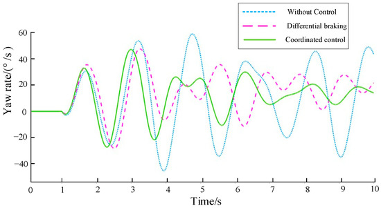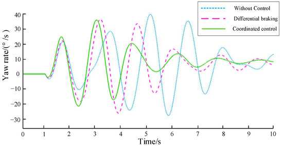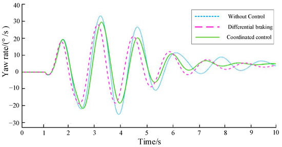Through simulation analysis, it can be seen that, under no-load conditions, when there is no control, the roll angle and yaw rate of the forklift body increase sharply, and are in a large-amplitude oscillation state without a trend of stabilization. Under differential braking control and coordinated control, the fluctuation in these two parameters is significantly reduced. In particular, the coordinated control has a better effect. The peak values of the body roll angle and yaw rate are controlled within 8.8° and 46°/s, with the maximum improvement of 11.7% and 26.1%, respectively, and the body roll angle and yaw rate quickly reach a stable state. Under half-load conditions, the peak values of the body roll angle and yaw rate under coordinated control are controlled within 8.2° and 35°/s, which is better than the no-control state and differential braking control, with the maximum improvement of 10.5% and 14.3%, respectively, and the maximum reduction in stabilization time is 30.3% and 22.4%, respectively. Under full-load conditions, the peak values of the body roll angle and yaw rate under coordinated control are controlled within 7.6° and 29°/s, with maximum improvements of 9.5% and 14.7%, respectively, and the maximum reductions in stabilization time are 33.5% and 20.2%, respectively. Although the yaw rate under coordinated control is slightly higher than that without control within 2 to 3 s, its peak value is still lower than that without control.