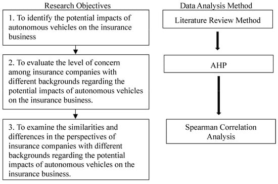The research objectives and corresponding data analysis methods of this study are illustrated in Figure 1. Research Objective 1 is to identify the potential impacts of autonomous vehicles on the insurance industry. This objective will be analyzed using the literature review method. The literature review method is a research approach that involves examining and analyzing the existing academic literature to organize information and identify research directions. Research Objective 2 aims to assess the level of concern among insurance companies with different backgrounds regarding the potential impacts of autonomous vehicles on the insurance business. This objective will be evaluated using the Analytic Hierarchy Process (AHP). The AHP is a decision-making tool that breaks down complex problems into a hierarchical structure and uses weight calculations to evaluate the priorities of different options. Research Objective 3 seeks to examine the similarities and differences in perspectives among insurance companies with varying backgrounds regarding the potential impacts of autonomous vehicles on the insurance industry. This objective will utilize Spearman correlation analysis to explore these perspectives. Spearman correlation analysis is a statistical method used to measure the degree of rank correlation between two variables.