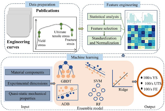 However, these previous studies have been devoted to the prediction of properties under quasi-static conditions and there is a gap in the prediction of material properties under high strain rates. In this study, a dataset of high-speed tensile mechanical properties of automotive steels was constructed. Through five machine learning models, the mapping relationship between the basic information of automotive steel and its YS, UTS, and fracture elongation (FE) at intermediate strain rates was established. Further, a super learner was built to further improve the prediction performance. Most importantly, the SHAP algorithm explored the quantitative correlation of input and output variables and identified the major determinants of the three tensile properties. The proposed method provides guidance and reference for reducing physical experiments and designing new materials for vehicles. A research architecture diagram of this work is shown in Figure 1.