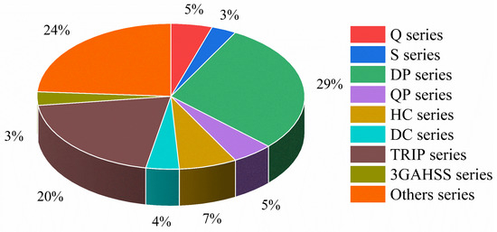 In this work, high-speed tensile experimental data of 65 automotive steels were collected to constitute a dataset from national and international published papers [4,11,12,13,14,15,16]. A total of 106 samples in the dataset each contained 23 input features and 3 outcomes covering chemical composition, sample size, quasi-static mechanical properties, and mechanical properties at 100/s. The distribution of major steel grades in the dataset and the statistical description of their features are shown in Figure 2 and Table 1, respectively.