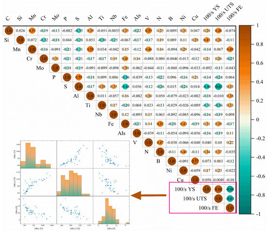 A correlation thermogram between the chemical composition and the target parameters is shown in Figure 3. According to Figure 3, the distribution of values of the correlation coefficient ranges from −1 to 1, where being closer to 1 means the stronger the positive correlation between features and labels, and being closer to −1 means the stronger the negative correlation between features and labels. In terms of the distribution of colors, a color closer to brown indicates a stronger positive correlation, closer to cyan indicates a stronger negative correlation, and closer to white indicates no correlation. As can be seen from the significant labeling in the figure, C, Si, Mn, S, Al, Ti, Fe, and N have strong correlations with the target parameters. This is consistent with our a priori knowledge, specifically that C is the key element that determines the hardness and strength of steel. As C content increases, the hardness and strength of steel increases, but plasticity and toughness decrease. Si increases the strength and hardness of steel and helps to deoxidize and refine the grain; it also improves high-temperature resistance and oxidation resistance. Manganese improves the strength and hardness of steel while maintaining good plasticity and toughness; it helps to eliminate the undesirable effects of S, such as thermal embrittlement, thus improving weldability and cold working properties. Mn increases the material’s resistance to strain hardening during dynamic tensile processes; S is a detrimental element in steel because it causes thermal embrittlement and reduces the steel’s low-temperature toughness; Al deoxidizes and forms stable oxides that improve the steel’s corrosion resistance; and Ti combines with N and C to form stable titanium carbide and titanium nitride, which reduces the aggregation of these elements at grain boundaries and improves the steel’s corrosion resistance and weldability. Therefore, the above component features are retained, and the remaining irrelevant features are removed.