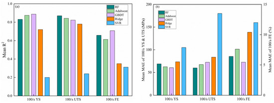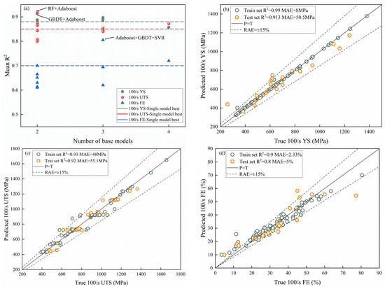 In addition, in order to obtain better prediction results, an ensemble learning model is constructed using the above model as the basic model. Considering the poor fitting effect of ridge regression, we use it as a meta-model and the remaining four models as basic models, and then cross-combine them to seek the best combination model. The predictive performance of all ensemble models is shown in Figure 5a. The results show that the predictive performance of the ensemble model is significantly improved compared to the single models. For example, the RF-Adaboost model is optimal when predicting 100/s YS with average R2 and MAE of 0.913 and 50.5 MPa, respectively. The GBDT-Adaboost model exhibits the lowest MAE and the highest R2 when predicting the 100/s UTS in the test set with values of 55.1 MPa and 0.92, respectively. And, the Adaboost-GBDT-SVR model is the best prediction model of 100/s FE in the testing set with MAE and R2 values of 5% and 0.8, respectively. Among some previous studies, they predicted strength better and elongation less well. Specifically, the R2 for predicting strength was above 0.9, but for predicting elongation, the R2 was only about 0.7 [7,22]. In this study, we have substantially improved the accuracy of the prediction of elongation. More detailed information can be found in Table 2. It is therefore concluded that the stack model provides a greater improvement in predicting dynamic mechanical performance than the single models, suggesting that the ensemble approach based on the underlying models is better suited to learning complex relationships and therefore reduces prediction bias.