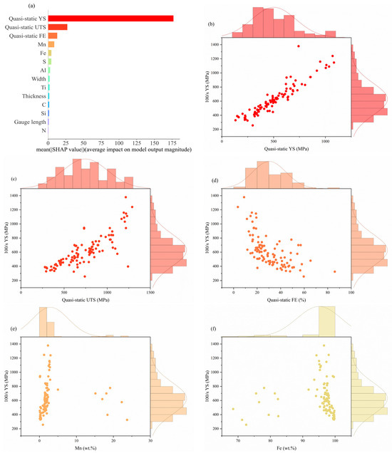 Figure 6b–f show joint scatter plots of higher importance features with 100/s YS. As the quasi-static YS and quasi-static UTS increase, the 100/s YS increases consequently, which is related to the strain-rate effect, and the strain-rate strengthening mechanism suggests that the strength increases with the strain rate [14,24]. As can be seen in Figure 6d, 100/s YS is smaller as the quasi-static FE increases, which is in line with our consistent knowledge of strength and elongation. In addition, too small or too large a Mn content can lead to a lower yield strength. When the Mn content is low, Mn cannot be sufficiently solidified in the aluminum matrix to form a solid solution, resulting in a weakening of the solid solution strengthening effect, which in turn leads to lower yield strength. Excessive Mn content may lead to oversaturation of the solid solution of Mn in the aluminum matrix, which may lead to the precipitation of Mn and the formation of second-phase particles, which, if oversized or unevenly distributed, may weaken the material properties, again leading to a reduction in yield strength.