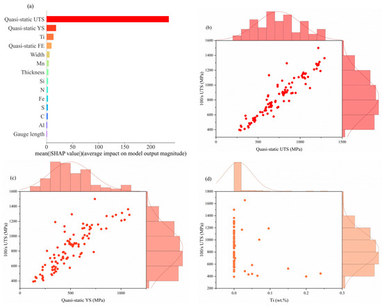 Figure 7b–f shows joint scatter plots of higher importance features with 100/s UTS. The relationship between quasi-static mechanical properties and 100/s UTS is similar to their relationship with 100/s YS and is not discussed here. From Figure 7d, it can be concluded that too little or too much Ti content leads to a decrease in tensile strength, so the content of Ti element needs to be controlled during material design to improve the tensile strength. A reliable explanation is that Ti is an effective grain refiner. The right amount of Ti forms stable nitrides (e.g., TiN) and carbides (e.g., TiC) with nitrogen (N) and carbon (C) in the steel. These compounds are stable at high temperatures and prevent the grain from growing, thus refining the grain. The finer the grain, the stronger the material. If the Ti content is too low, the grain refinement effect is weakened and the grain size increases, resulting in lower tensile strength. Secondly, excessive Ti may lead to excessive precipitation of TiN or TiC, and these compounds, if oversized or unevenly distributed, will reduce the plasticity and toughness of the material, thereby reducing the tensile strength. For width, as the width increases, the cross-sectional area of the sample increases with it, i.e., resulting in lower tensile strength.