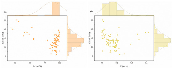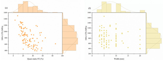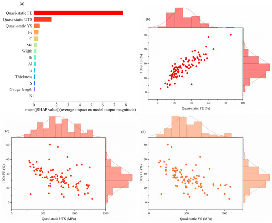 From Figure 8a, it is easy to see that the top three features contributing most to the prediction of 100/s FE are the properties under quasi-static conditions, followed by Fe, C, Mn, width, and Si. From Figure 8b–f, it can be seen that 100/s FE is negatively correlated with the quasi-static mechanical properties, which is consistent with the previous discussion. Secondly, too much C will lead to a decrease in FE due to the fact that too much C leads to the formation of more carbides (e.g., Fe3C), which are hard and brittle and tend to be distributed along the grain boundaries, resulting in a decrease in the plasticity and toughness of the steel and, hence, in the elongation after fracture.