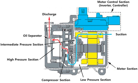 Noise reduction is a crucial factor in improving the performance and NVH (noise, vibration, and harshness) characteristics of electric compressors, and various studies have been conducted to achieve this. Previous research has primarily focused on applying soundproofing materials, damping materials, and acoustic absorption structures as approaches to reducing noise [6,7,8,9].