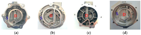 Figure 3 shows the rear housing structures of the four competitors. In each image, ‘S’ and ‘D’ show the low-pressure and high-pressure sections, respectively. Table 1 shows a comparative analysis of the discharge space volumes. The discharge space volume, which is the high-pressure section, is where the compressed fluid remains just before being discharged. This volume significantly influences both compressor performance and its noise and vibration characteristics. If the discharge space is too large, the compressed fluid may expand excessively, increasing pressure pulsations and leading to higher noise and vibration levels. Conversely, if the discharge space is too small, the high-pressure fluid may not diffuse sufficiently within the compressor, resulting in pressure losses. Therefore, an optimally designed discharge space is crucial not only for enhancing compressor performance but also for reducing noise. This study aims to analyze the relationship between discharge space volume and noise and vibration characteristics and to achieve compressor noise reduction through optimized design [14].