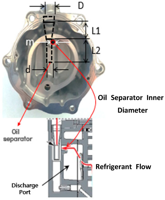 The oil separator is a device that separates refrigerant and oil, returning the oil to the compressor to maintain its efficiency and stability. Figure 4 shows the housing structures designed for installing oil separators, and Table 2 shows a comparative analysis of the dimensions of oil separator installation structures among the four competitors. Flow-induced noise can be amplified by pressure pulsations and turbulence that occur during the mixing or separation of refrigerant and oil. Therefore, optimizing the dimensions of the oil separator mounting structure—such as the flow passage cross-section, inlet and outlet shape, and internal chamber size—can help ensure smooth fluid flow, effectively reducing noise and vibration caused by pressure fluctuations. This optimization not only reduces overall compressor noise but also improves system stability and performance [16,17].