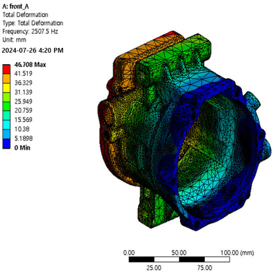 The housing modeled in CATIA was imported into the Modal tool of ANSYS. The material properties of ADC12 aluminum alloy were applied, and the fastening holes were defined as constrained surfaces. Subsequently, modal analysis was performed. Figure 6 shows a modal analysis of the compressor housing using the ANSYS Modal tool. The analysis identifies natural frequencies and visualizes the deformation distribution through color mapping, allowing for the assessment of structural responses at specific frequencies. Identifying areas of maximum deformation helps optimize the housing’s structural rigidity and improve its design for noise reduction [2,12,13,15].