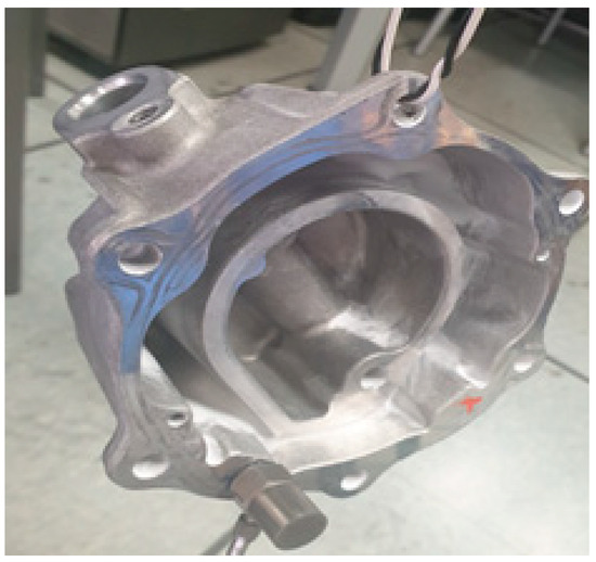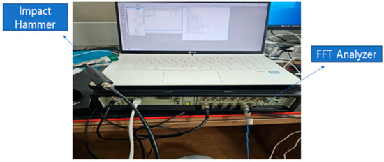 Impact hammer modal testing experiments were conducted on the competitors’ housing. The testing utilized an accelerometer sensor, an impact hammer, and an FFT (Fast Fourier Transform) signal analyzer. During the experiment, an accelerometer sensor was attached to the housing, and an impact hammer was used to apply force to the housing. The accelerometer sensor collected vibration data, which were input into the FFT signal analyzer. The analysis was performed using dedicated experimental software, which processed the collected data and provided the results. To eliminate the effects of external contact during the experiment, the housing was suspended in the air using a string. Multiple measurements were taken to minimize minor errors and ensure accurate results. Additionally, measurements were conducted with the sensor attached at different positions on the housing. Figure 7 shows the housing suspended in the air with sensors attached in preparation for the impact hammer modal measurement experiment [7,21].