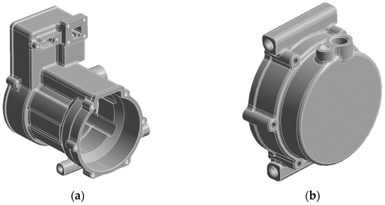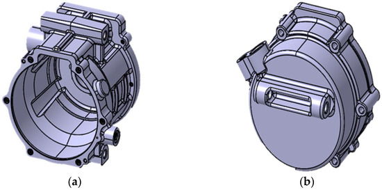 Modal analysis was conducted on the redesigned housing to determine its natural frequencies, incorporating modifications aimed at suppressing the transmission of vibration and acoustic energy. Ribs, thin and elongated structural features, are added to enhance the structural rigidity of a component. They play a significant role in reducing vibrations and enhancing structural stability. Mounting lugs are protruding components used to mount or secure mechanical components, contributing to increased fastening strength and the dispersion of vibration transmission. For the Front Housing, ribs were added to the side sections of the outer wall, and the inverter installation section was removed to simplify the structure. In addition, the number of mounting lugs was increased from one to two. For the Rear Housing, the outer wall ribs were enhanced, and the thickness of the bottom wall was increased from 4.0 mm to 6.5 mm. As in previous analyses, the material properties of ADC12 were applied, and the fastening holes were defined as constrained surfaces. Modal analysis was then subsequently conducted under these conditions. Figure 11 shows the shape of the redesigned housing. Table 7 presents the number of nodes and elements for each housing model.