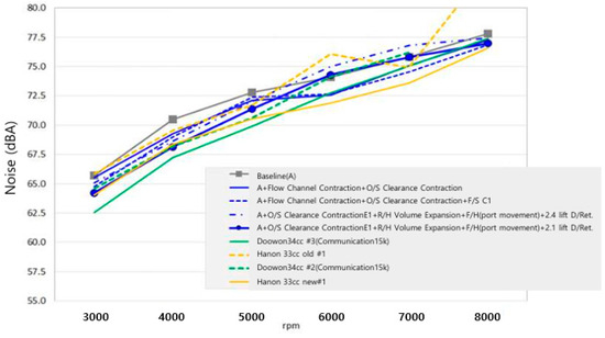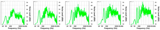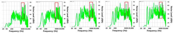Noise analysis is a process that identifies frequency bands with high dB levels based on measured noise data and determines the primary causes of noise within those bands. This process involves analyzing the physical characteristics of noise, such as sound pressure levels, frequency bands, and temporal variations. Throughout the frequency analysis, it allows for identifying whether the noise falls within low-frequency or high-frequency ranges. This helps determine the noise source, such as low-frequency noise caused by mechanical vibrations or high-frequency noise resulting from the operation of electronic components. Based on the analysis results, effective noise reduction strategies can be developed. For instance, noise caused by resonance can be mitigated by redesigning the housing to avoid resonance frequencies, while noise stemming from pressure pulsations can be reduced by adjusting the design of the inlet and outlet flow paths and clearances [20,21,22,23].