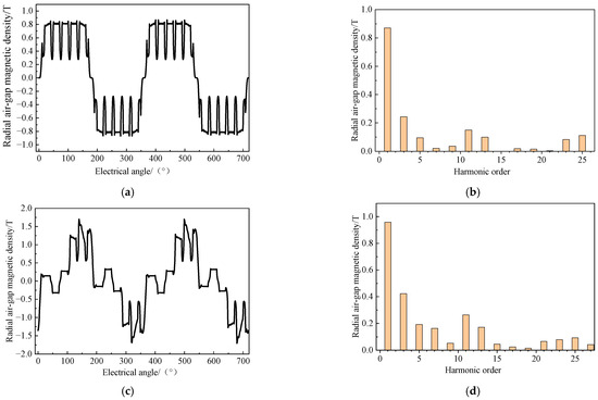 The radial air gap magnetic density waveform and FFT spectrum. (a) The radial air gap magnetic density under the no-load condition. (b) The FFT spectrum of the no-load radial magnetic density. (c) The radial air gap magnetic density under the load condition. (d) The FFT spectrum of the radial air gap magnetic density under load.