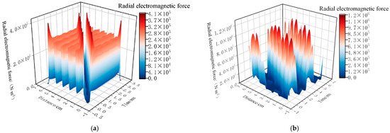 Based on the obtained no-load air gap magnetic flux density and load air gap magnetic flux density, the radial electromagnetic force at the air gap radius is calculated using the Maxwell stress equation, as shown in Figure 3. The distribution of the radial electromagnetic force over time and space obtained using 2D Fourier transform is shown in Figure 4.
