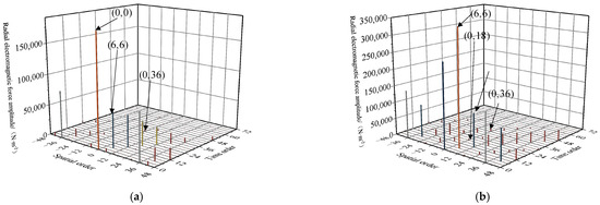 2D FFT analysis of the electromagnetic force for the 6-pole 36-slot motor. (a) 2D FFT analysis of the electromagnetic force under the no-load condition. (b) 2D FFT analysis of the electromagnetic force under the load condition.