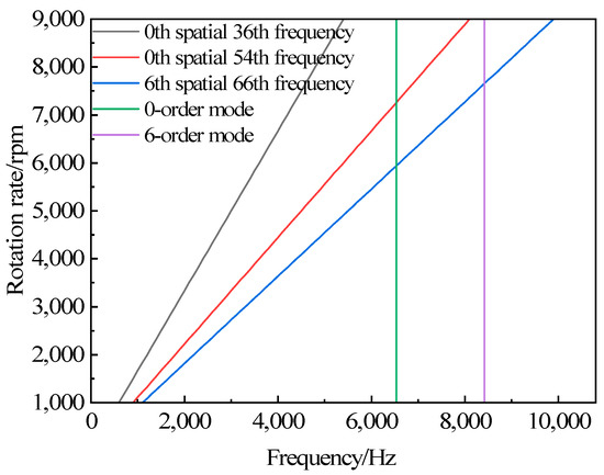Due to the wide operating speed range of electric vehicles, in order to better analyze the noise response of the motor in the full speed range, the possible resonance points of the main low-order radial electromagnetic force of the motor during a multi speed range operation were first predicted. The electromagnetic force (0,36) has a low order and large amplitude, resulting in a significant vibration noise. The electromagnetic forces (0,54) and (6,66) intersect with the natural frequencies of the 0th and 6th modes, respectively, which may cause a significant vibration noise. The main distribution of the predicted noise is shown in Figure 5.