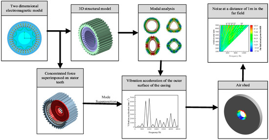 In order to verify the effectiveness of the electromagnetic force and modal coupling analysis method, a multphysics coupling simulation model was established. According to reference [20,21], a simulation model was established as shown in Figure 6. In the multiphysics field analysis model, the electromagnetic force finite element model, modal finite model, and harmonic response coupling analysis method are simultaneously used to solve the vibration noise response. The electromagnetic force acting on the stator teeth was calculated using a two-dimensional electromagnetic model, and the electromagnetic force was reflected in the form of the concentrated force. The obtained electromagnetic force on the teeth was imported into the three-dimensional structural model. Combined with the modal analysis results of the three-dimensional structural model, the modal superposition method was used to solve the surface vibration acceleration of the casing. An air domain was established at a distance of 1m from the far field, and the surface acceleration of the casing was added to the inner surface of the air domain. Then, the noise at a distance of 1m from the far field of the motor was solved.