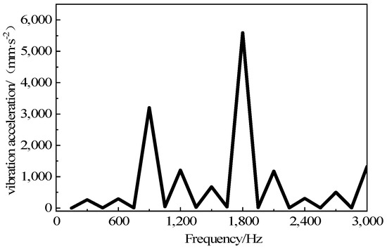 By using the multiphysics coupling simulation model mentioned above, the vibration acceleration of the motor under the rated operating condition of 3000 rpm in this paper was simulated, and the vibration acceleration on the surface of the casing was obtained as shown in Figure 7. Through an analysis of Figure 7, it can be seen that the frequency of the vibration acceleration is the same as the frequency of the excitation force wave, both of which are even multiples of the fundamental frequency of the motor current. It can also be seen that the maximum vibration acceleration of the motor in this paper is at the 18th and 36th harmonics. Combined with the analysis of the radial electromagnetic force of the motor mentioned above, it is mainly caused by the harmonics (0,18) and (0,36) of the radial electromagnetic force.