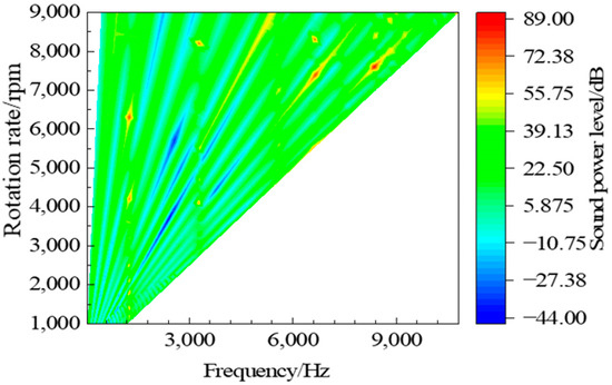 Based on the multiphysics coupling model established above, a finite element simulation was carried out on the noise spectrum characteristics of the motor in the full speed range of 1000–9000 rpm in this paper. To obtain accurate results, the noise-equivalent radiation power-level waterfall diagram was obtained by increasing the step size at 100 rpm, which is shown in Figure 8. It can be seen that when the operating frequency is close to 36th, 54th and 66th harmonics, the amplitude of the electromagnetic noise is large. In addition, there are sound power peaks at 6600 Hz and 8360 Hz, which are similar to the natural mode 0th and 6th order, and resonance phenomena occur. The resonance point predicted by the method based on the electromagnetic force and modal coupling is basically the same as the results of the multiphysics simulation.