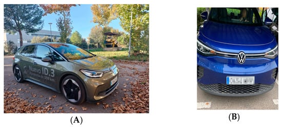 Electric cars used in the experiment. (A) ID.3 in Caceres. (B) ID.4 Madrid.