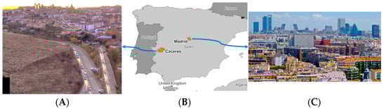 The characteristics of the road also influence the effectiveness of eco-driving principles. Accordingly, the experiment is replicated in different routes (scenarios) that could have various types of road sections. The case study selected to apply the driving experiment includes routes in Madrid, as an example of a large metropolis with a complex transportation network and high urban density (5460 inh/km2), and Caceres as a small city, which is located in the largest municipality in Spain (1750 km2) with a population of 96,441 inhabitants (55 inh/km2) [18]. Figure 2 shows their location on the Iberian Peninsula and two pictures illustrating their typology.