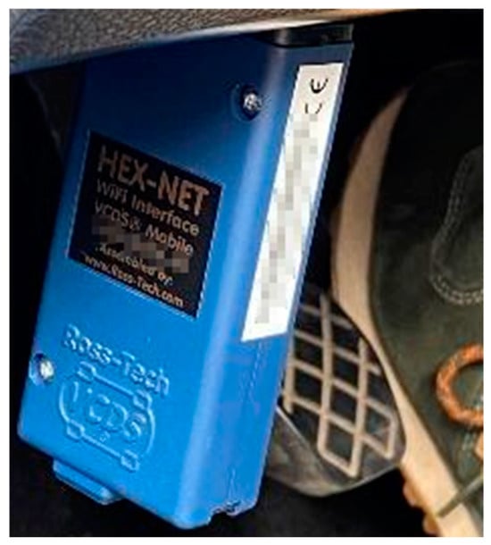 This experiment requires two sets of data. The vehicle’s on-board diagnostic (OBD) holds the first one, which is used to compute the vehicle’s energy consumption (‘’) and traveled distance (‘’) between consecutive readings and . In the EVs of our case study, OBDs provide their battery history data as accumulated values in kWh of electric energy discharged (‘’) and charged (‘’, due to regenerative braking) at the time of the ith reading. The balance (‘’) of these measurements between readings and provides the energy consumption of the electric car during that period. In ICEs, the OBD reports the evolution of the fuel consumption rate (volume/time). Calling the instant when the ith reading occurs ‘’ and the average fuel consumption rate between readings and ‘’, the fuel volume spent between and (‘’) is known. Finally, could also be calculated using a conversion factor (energy/volume) [19] ‘’ corresponding to the fuel under use. Equation (1) shows these formulas. In our case study, we accessed the real-time consumption through the OBD II protocol [20]. Since this measurement is not part of the open part of the specification, we had to choose a proprietary device compatible with a manufacturer group that produces several car brands popular in Spain, shown in Figure 3.