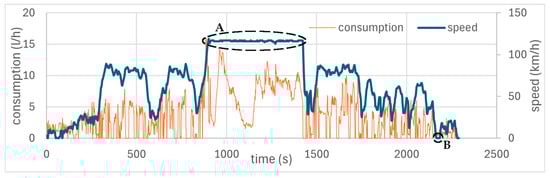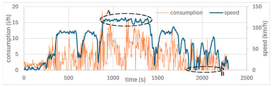 Speed and consumption of a driver in a manual ICE vehicle following one of the routes of the experiment on a working Wednesday around 10:30, before learning eco-driving techniques, where, A highlights the interurban segment of the route and B refers to one stop.