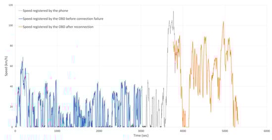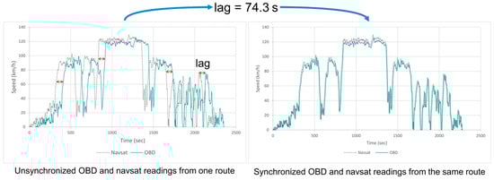 In our case study, we solved this issue by comparing the vehicle speeds provided by the OBD and the mobile phone’s navsat sensors. As can be seen in the example of Figure 6, both devices provide very similar records, which were used to determine the lag between their time series for each driving session. This way, we could link through time fuel consumption from the OBD to the positions of the vehicle from the mobile phone.